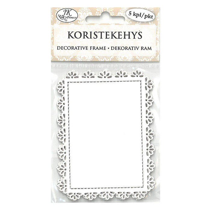 Kartonkiset koristekehykset esimerkiksi korttiaskarteluun. Kehyksen koko on noin 9,5cm x 7cm ja vahvuus 230g/m². Pakkauksessa on 5kpl.