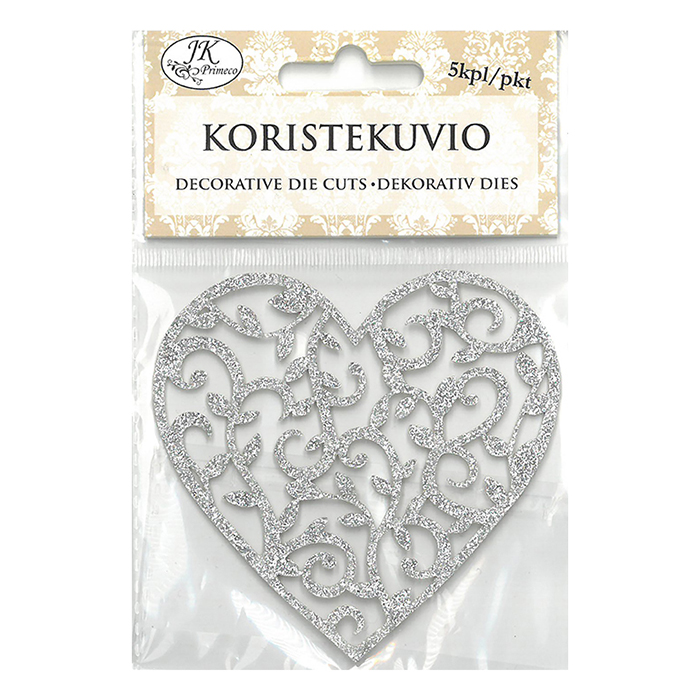 Glitter sydänkuviot esimerkiksi korttiaskarteluun. Kuvion koko noin 7,5cm x 7,5cm ja kartongin vahvuus 250g/m². Pakkauksessa on 5 kpl.