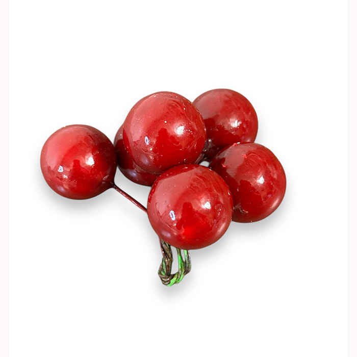 Punaiset koristemarjat esimerkiksi jouluisiin kransseihin ja asetelmiin.  Nipussa kuusi punaista marjaa, joiden halkaisija noin 25mm. Marjat ovat rautalangalla nipussa, mutta ne saa helposti irralleen.