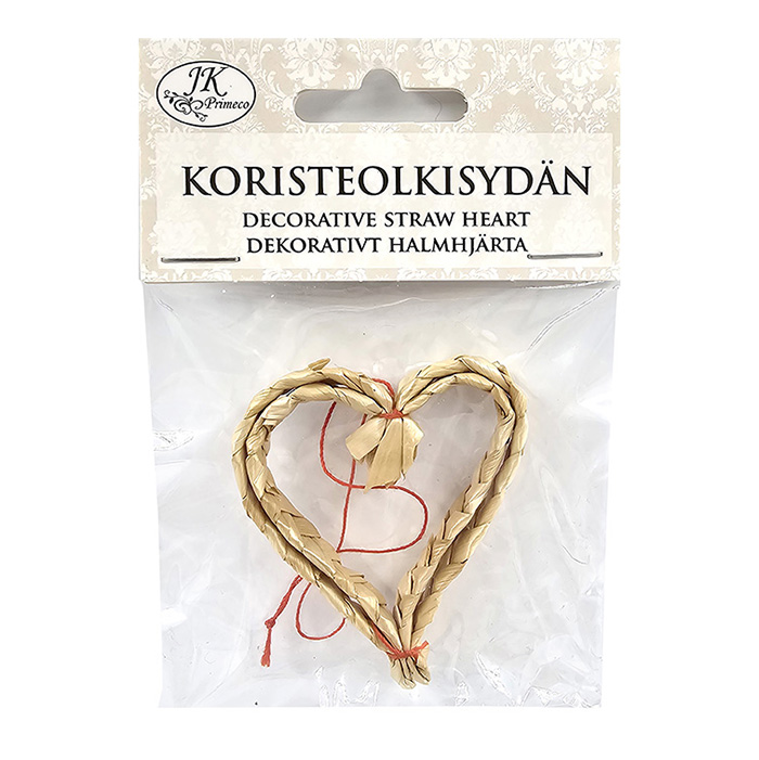 Koristeolkisydän esimerkiksi jouluisiin asetelmiin, kransseihin tai minimaailmoihin. Olkisydämen koko noin 6x5cm. Pakkauksessa 1kpl.