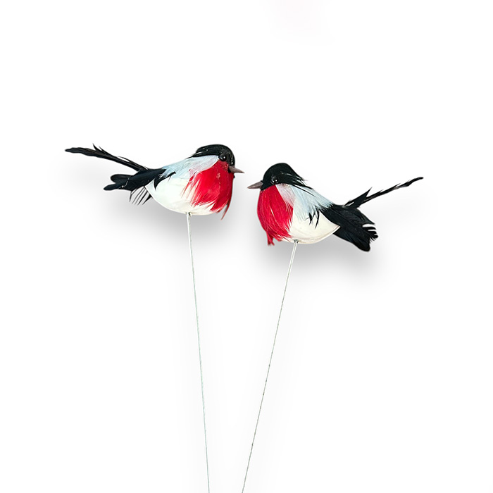 Punatulkku koristeet esimerkiksi jouluisiin kransseihin ja asetelmiin. Punatulkun koko noin 2,5x6cm ja korkeus tikun kanssa noin 18cm. Pakkauksessa 2 kpl.