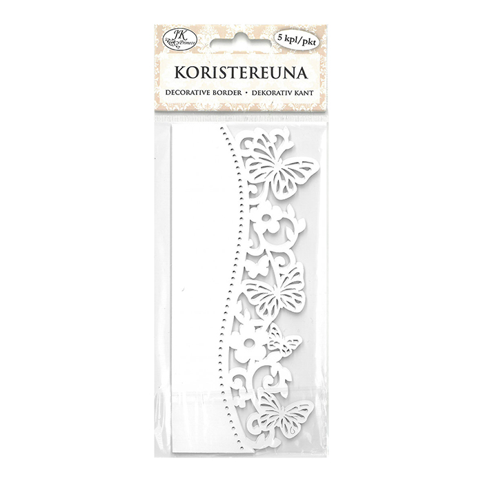Kaunis perhoskoristereunus esimerkiksi korttiaskarteluun ja muuhun koristeluun. Kuvion koko noin 14,5 x 6,5cm. Pakkauksessa 5 kpl.