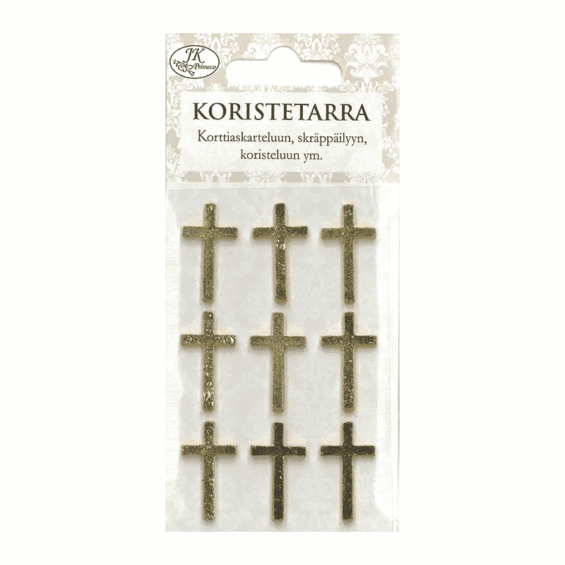 Metalliset risti koristetarrat esimerkiksi korttiaskarteluun. Ristin koko noin 1,5×2,5cm. Pakkauksessa 9 tarraa.