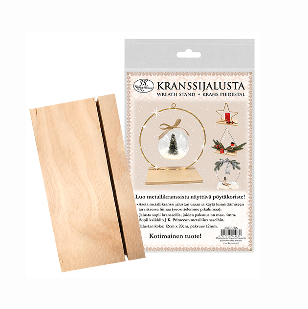 Kranssijalustalla teet metallikranssista upean pöytäkoristeen. Aseta max. 4mm paksuinen metallikranssi puisen jalustan uraan. Käytä tarvittaessa liimaa. Jalustan koko 12x 20cm, paksuus 12mm.