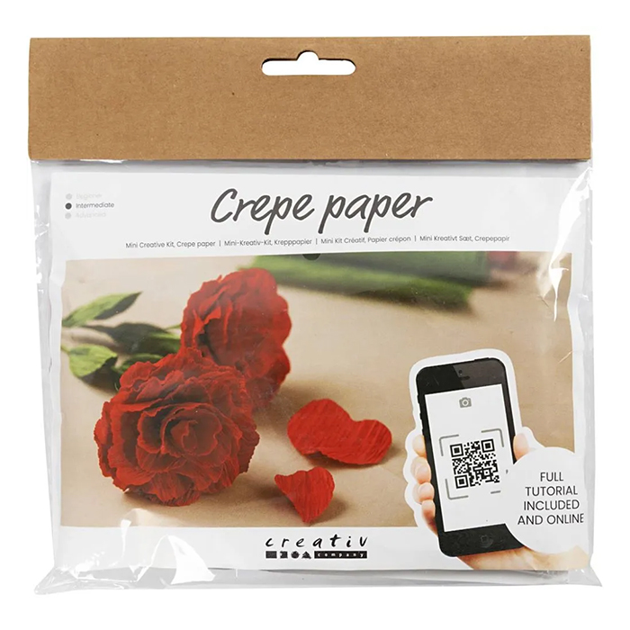 Askartelusetti, jossa tarvikkeet paperikukkien tekoon kreppipaperista. Pakkaus sisältää kreppipaperia, kukanvarret ja liiman sekä kuvalliset ohjeet. Jos haluat seurata ohjeita verkossa, skannaa pakkauksen päällä oleva QR-koodi.