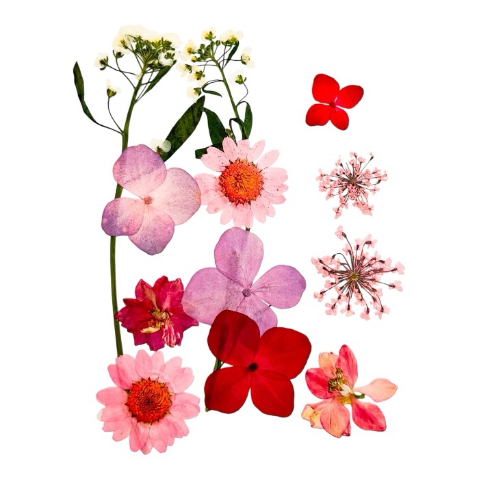 Värilajitelma erilaisia kuivattuja kukkia, jotka sopivat upeasti esimerkiksi hartsikorujen tekoon. Huom! Kukissa saattaa olla vaihtelua myyntikuvaan verrattuna.
