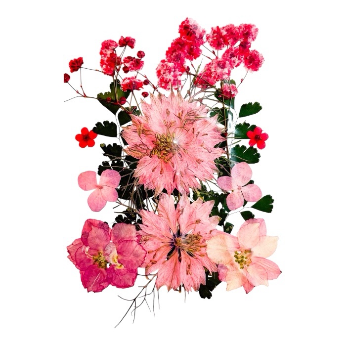 Värilajitelma erilaisia kuivattuja kukkia, jotka sopivat upeasti esimerkiksi hartsikorujen tekoon. Huom! Kukissa saattaa olla vaihtelua myyntikuvaan verrattuna.