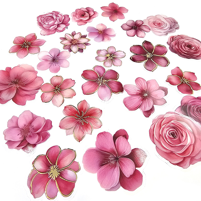 Upeat kukkatarrat esimerkiksi korttiaskarteluun ja muuhun koristeluun. Pakkauksessa on 25 kpl erilaisia muovisia tarroja kahdessa eri koossa. Osassa tarroista on kultainen foliopainatus. Tarrojen koot ovat noin 5cm ja 6,5cm.