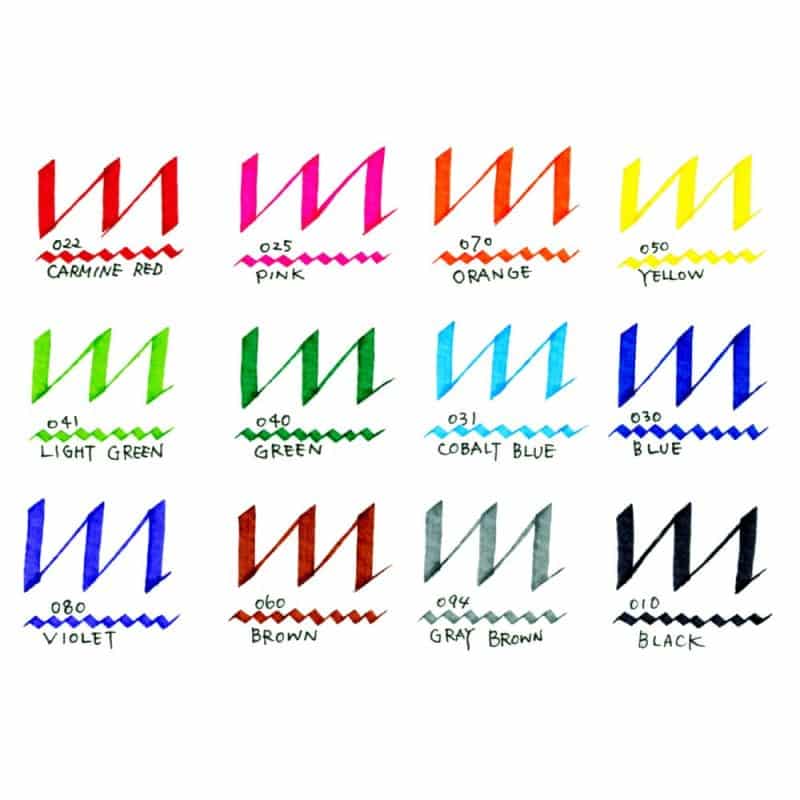 | ZIG Kalligrafia kynän väri | 022 Carmine Red, 025 Pink, 070 Orange, 050 Yellow, 041 Light Green, 040 Green, 031 Cobalt Blue, 030 Blue, 080 Violet, 060 Brown, 094 Gray Brown, 010 Black |
