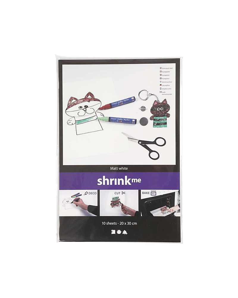 Kutistemuovilla voit tehdä esimerkiksi avaimenperiä, koruja ja magneetteja. Piirrä ja väritä muoville haluamasi kuva, leikkaa irti ja paista kotiuunissa, joilloin muovi kutistuu 40% koostaan. Muoveissa on toinen puoli matta, ja toinen kiiltäväpintainen. Mattapintaista voidaan koristella värikynillä ja kiiltävälle puolelle käy permanent tussit. Voidaan käyttää myös lasi- ja posliinitusseja. Arkin koko on 20x30cm ja pakkauksessa tulee 5kpl.