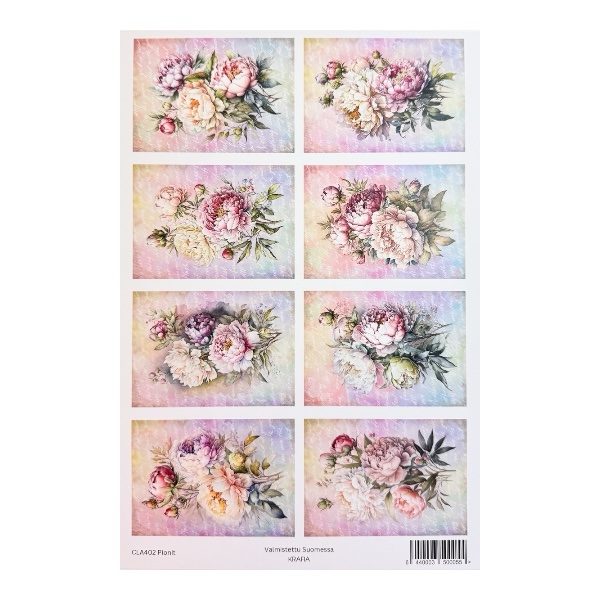 A4 kokoinen kuva-arkki, jossa ihania kuvia esimerkiksi korttiaskarteluun. Kartongin vahvuus 250g. Valmistettu Suomessa.