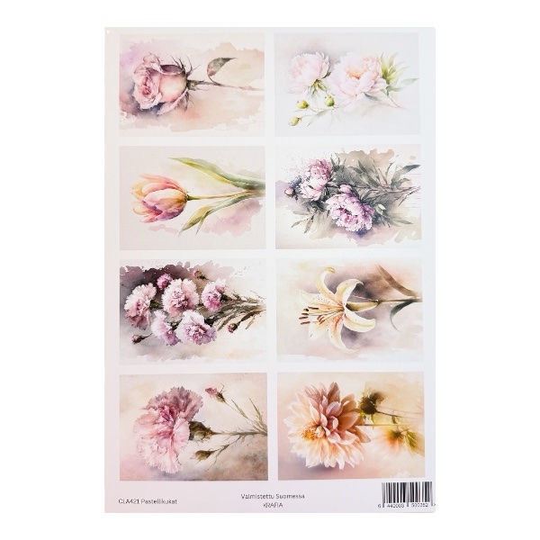 A4 kokoinen kuva-arkki, jossa ihania kuvia esimerkiksi korttiaskarteluun. Kartongin vahvuus 250g. Valmistettu Suomessa.