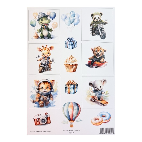 A4 kokoinen kuva-arkki, jossa ihania kuvia esimerkiksi korttiaskarteluun. Kartongin vahvuus 250g. Valmistettu Suomessa.