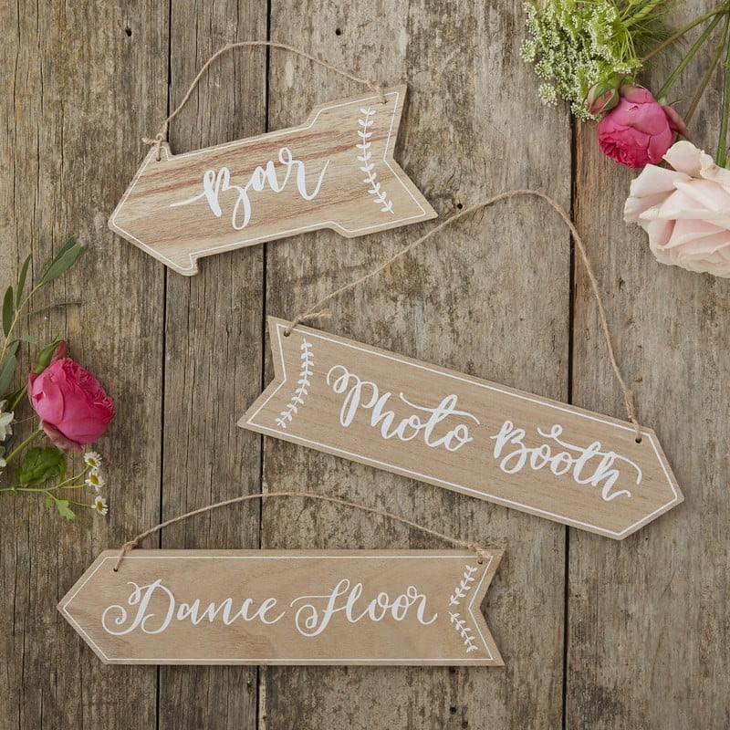 Pakkaus sisältää kolme puista kylttiä narukiinnityksillä. Kylttien koko 31 x 8 cm 2 kappaletta ja 22 x 9 cm yksi kappale.