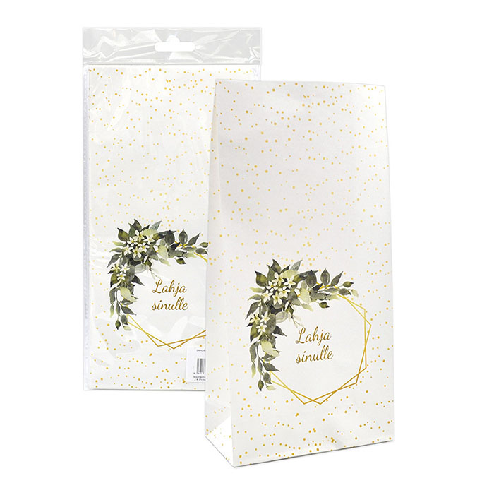 Kaunis paperilahjapussi.  Pussin koko noin 28,5 x 14 x 7cm. Pakkauksessa 5kpl.