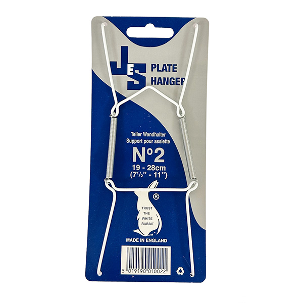 Mukautuva valkoinen metallivahvisteinen ripustin posliini- ja keramiikkalautasille. Sopii 19-28cm lautaselle.