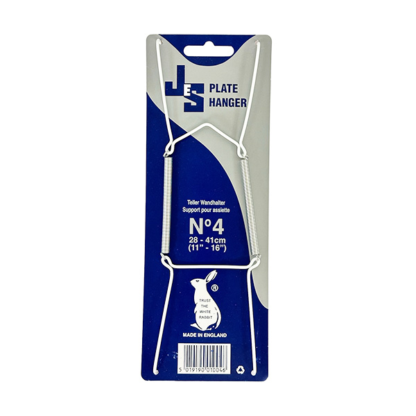 Mukautuva valkoinen metallivahvisteinen ripustin posliini- ja keramiikkalautasille. Sopii 28-41cm lautaselle.