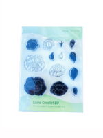 Kirkkaassa leimasinsetissä yhteensä 13 leimasinta, joilla saa laimattua kerroksellisia kukkia. Leimasimet kiinnitetään akryylipalikkaan.