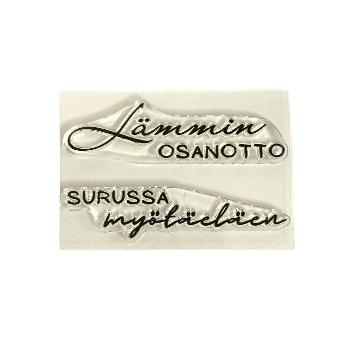 Kirkas leimasinsetti, jossa 2 erilaista leimasinta korttiaskarteluun. Leimasimien koko noin 7,5x2cm. Leimasimet asetetaan akryylipalaan leimatessa.