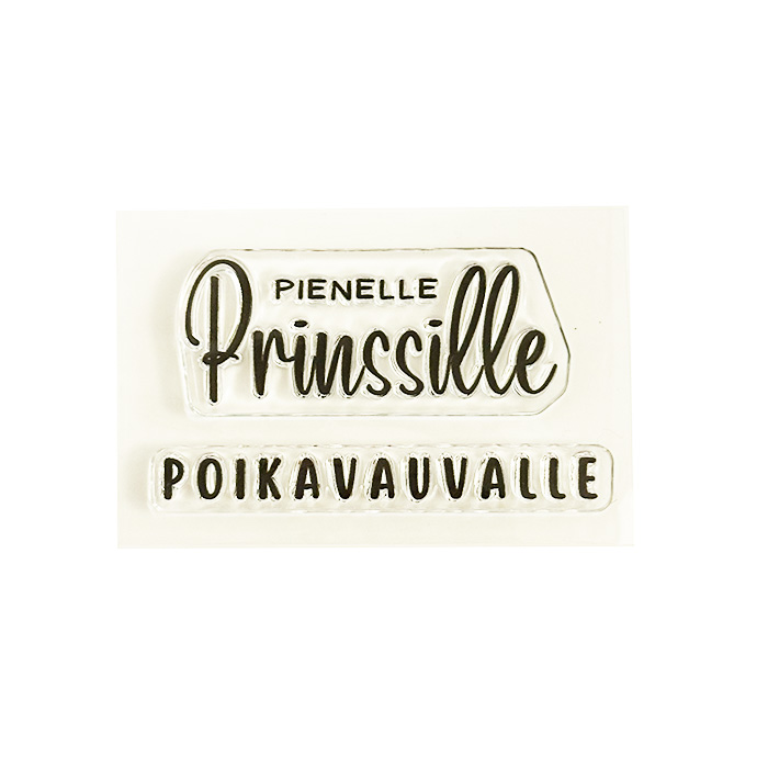 Kirkas leimasinsetti, jossa 2 erilaista leimasinta korttiaskarteluun. Isomman leimasimen koko noin 2,5x6cm. Leimasimet asetetaan akryylipalaan leimatessa.