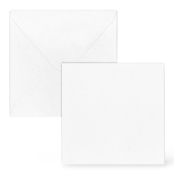 2-osaiset neliökorttipohjat ja kirjekuoret. Molemmissa tekstuuripinta. Pakkauksessa 5 kpl molempia. Korttipohjan koko n. 13,3cm x 13,3cm ja kirjekuoren 13,9×13,9cm.