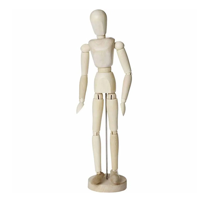 Puinen nivelletty mallinukke, jonka korkeus noin 30cm.