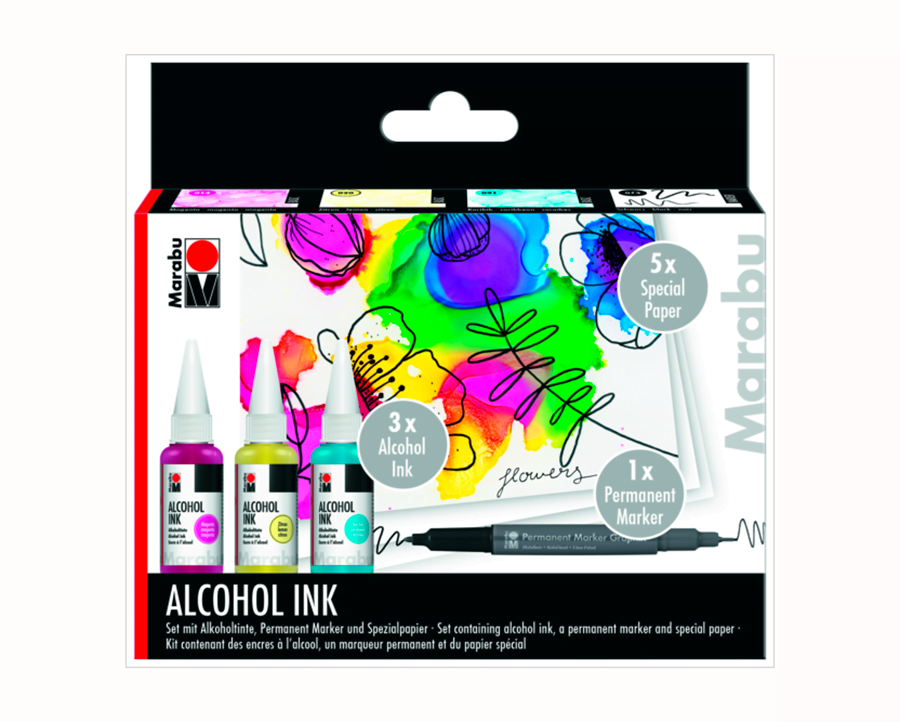 Lisäksi pakkauksessa 5 kpl alkoholimusteille soveltuvaa erikoispaperiarkkia (14,8 x 10,5 cm) ja kaksipäinen, musta Marabu Permanent Marker -tussi tasapäisellä 0,5 mm ja pyöreällä 1 mm kärjellä.