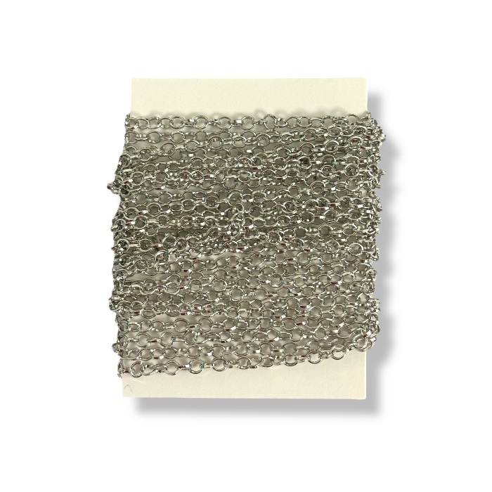 Hopean värinen metalliketju esimerkiksi koruaskarteluun. Lenkin koko 3x4mm. Ketjun pituus 4 metriä. Materiaali on nikkelitön korumetalli.
