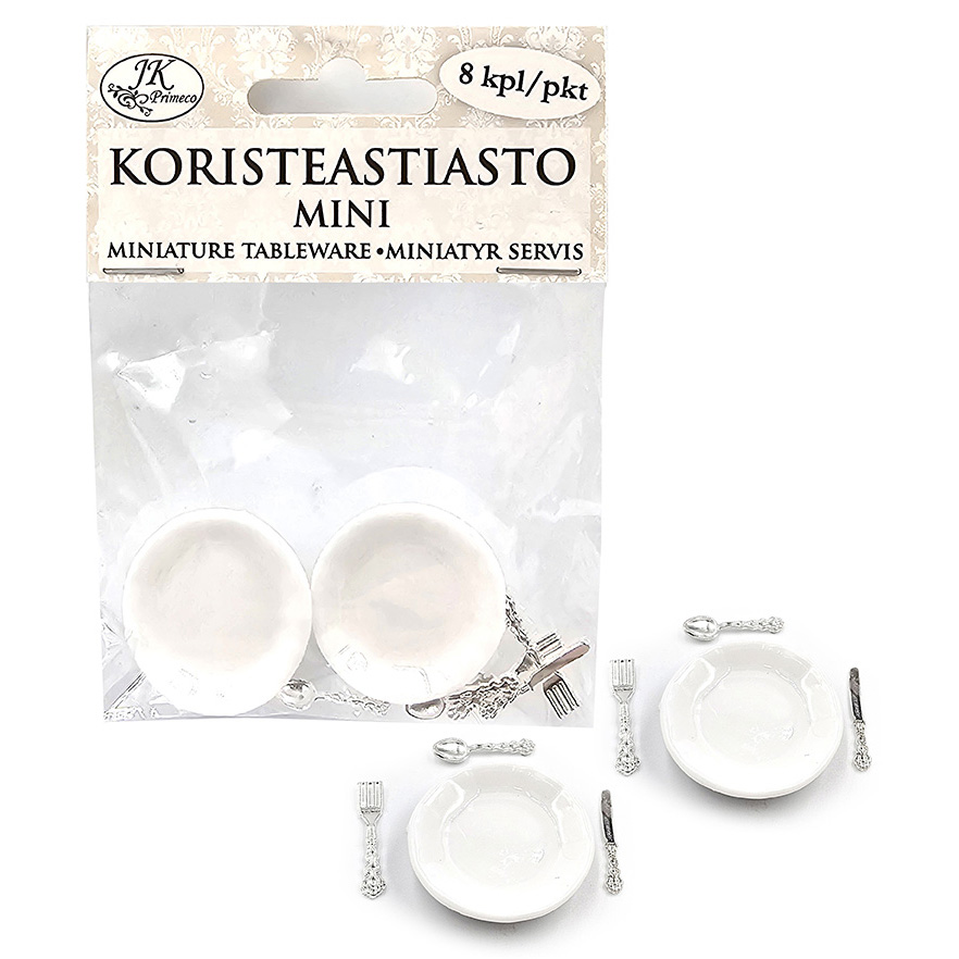 Koristeastiasto koristeluun ja minimaailman rakentamiseen. Pakkaus sisältää kaksi muovista lautasta ja aterimet. Lautasen halkaisija on n. 3cm ja aterimien pituus n. 2cm.