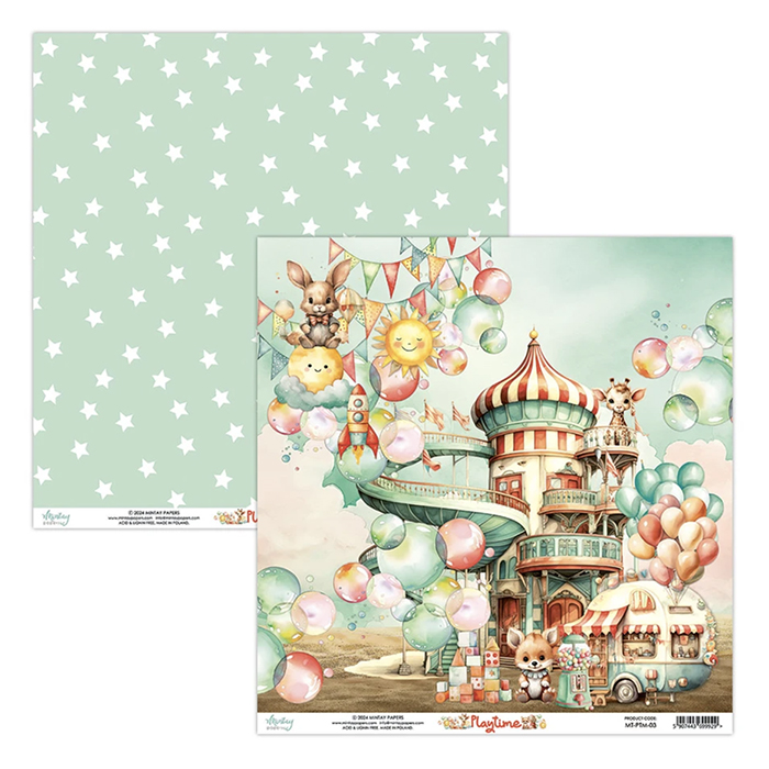 Mintay Papersin kaksipuoleinen kartonki esimerkiksi korttiaskarteluun tai skräppäilyyn. Kartongin koko 30,5×30,5cm, vahvuus 240g/m2.