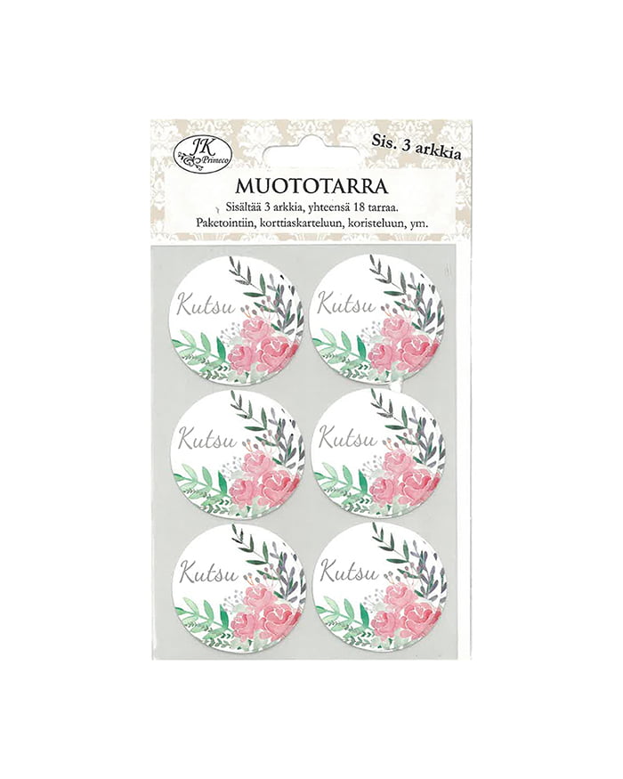 Paperiset kutsu muototarrat esimerkiksi korttiaskarteluun. Tarran halkaisija 4cm. Pakkauksessa 3 arkkia, yhteensä 18 tarraa.