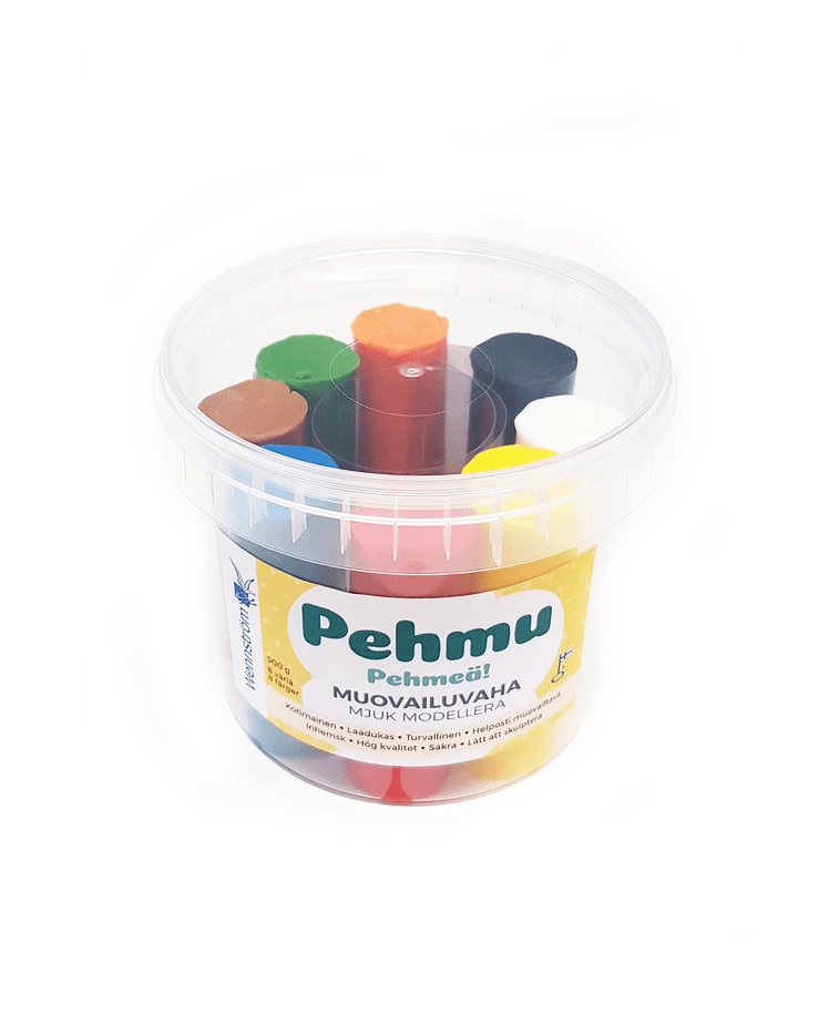 Muovailuvaha-astia PEHMU sisältää eri värisiä muovailuvahoja, jotka ovat puhdistettua mehiläisvahaa ja joiden väriaineina on käytetty elintarvikevärejä. Vahat ovat kotimaisia ja helposti muovailtavissa! Astian sisältämä vaha on lapsille vaaratonta eikä sisällä vehnää. Se ei myöskään tartu sormiin tai sotke ja se pitää hyvin koostumuksensa. Mehiläisvahapohjainen vaha pehmenee lämmön vaikutuksesta, joten pienille lapsille voit pehmittää sitä käsissäsi.