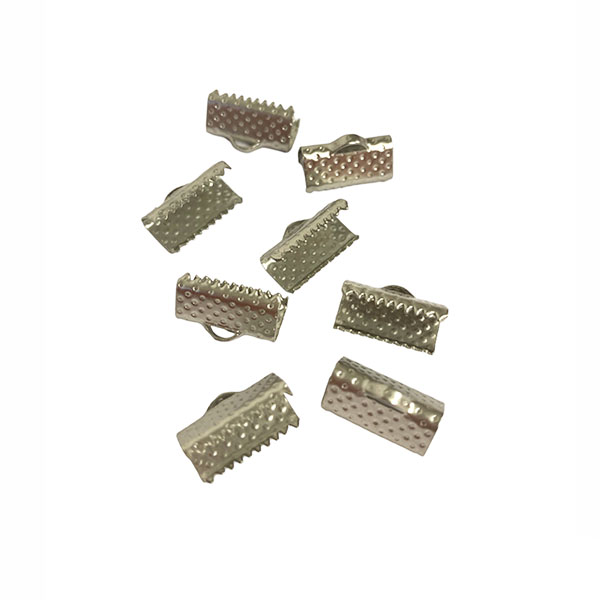 Nauhanpää, joka puristetaan kiinni litteään nauhaan. Päällä ripustuslenkki. Nauhanpään koko noin 13x6mm. Materiaali nikkelitön korumetalli. Pakkauksessa 8 kpl.