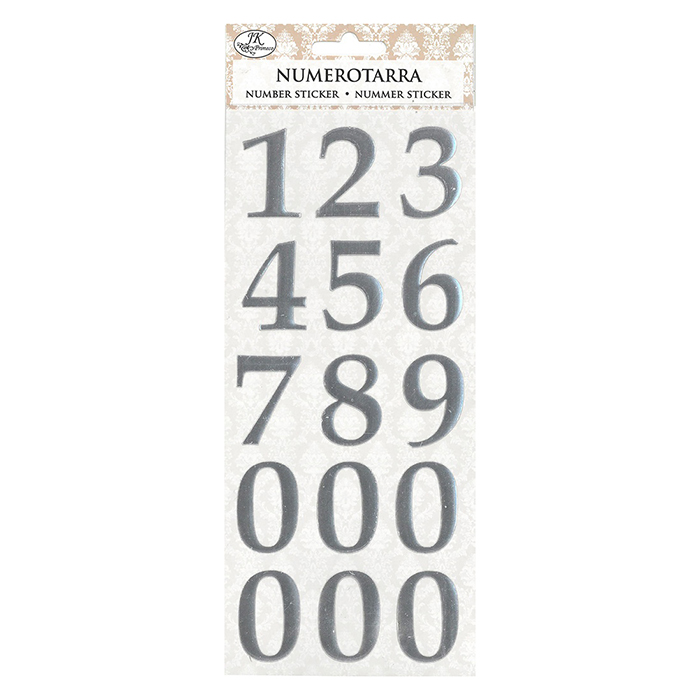 Numerotarrat esimerkiksi korttiaskarteluun. Arkissa muoviset numerotarrat 0-9. Numeroiden korkeus noin 3,5cm. Tarroissa on hopea foliopainatus. Pakkaus sisältää yhden arkin.