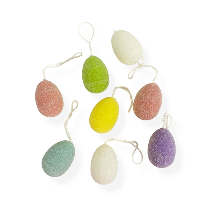 Pääsiäismunakoristeet asetelmiin, kransseihin ja muuhun pääsiäiskorsteluun. Munissa ripustusnauha valmiina. Munien koko noin 5×3,5cm. Pakkauksessa 8kpl pastellin sävyisiä munia.