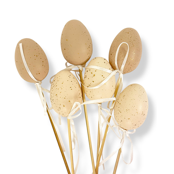 Pääsiäismunakoristeet  asetelmiin ja muuhun pääsiäiskoristeluun. Munan koko noin 6×4,5cm ja koristeen korkeus tikun kanssa yhteensä noin 26cm. Pakkauksessa 6 kpl koristeita.