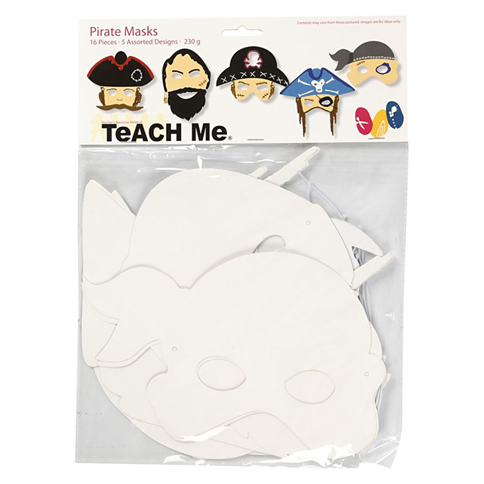 Muotoonleikatut valkoiset pahvinaamiot, jotka voi värittää ja koristella mieleisekseen. Pahvin vahvuus 230g/m2. Naamioiden korkeudet noin 16-26 cm ja leveydet 17,5-26,5 cm. Pakkauksessa 16 kpl naamioita. Kuminauhat tulevat mukana.