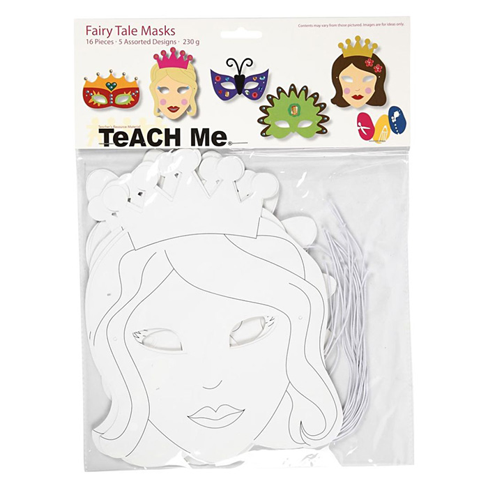 Muotoonleikatut valkoiset pahvinaamiot, jotka voi värittää ja koristella mieleisekseen. Pahvin vahvuus 230g/m2. Naamioiden korkeudet noin 13,5-25 cm ja leveydet 17-25 cm. Pakkauksessa 16 kpl naamioita. Kuminauhat tulevat mukana.