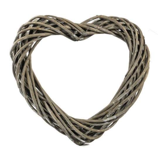 Harmaa sydämen mallinen pajukranssi, jonka voit koristella mieleiseksi esimerkiksi nauhoilla ja koristeilla. Kranssin koko noin 30x28cm ja paksuus noin 4,5cm. Huom. kranssi on luonnonmateriaalia, joten koko voi hieman vaihdella.