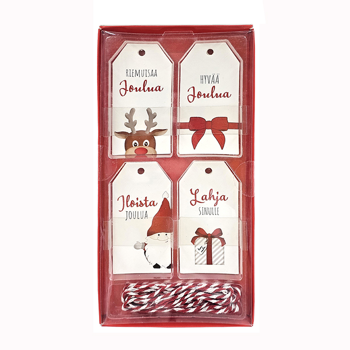 Pakettikorttisetti joululahjojen paketointiin. Pakkauksessa 4 erilaista pakettikorttia, yhteensä 20 kpl. Kortin koko noin 4cm x 8cm ja narun pituus n. 3m.