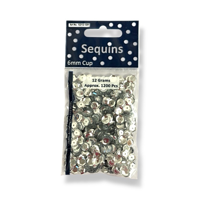 Hopean väriset paljetit askarteluun ja tekstiilien koristeluun. Paljetin halkaisija on 6mm. Pakkauksessa 12 grammaa paljetteja.