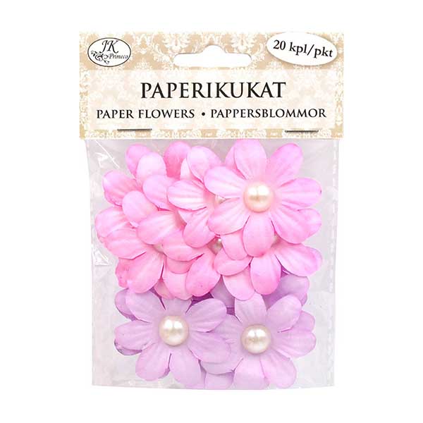 Paperikukat esimerkiksi korttiaskarteluun, skräppäilyyn ja muuhun koristeluun. Kukissa helmi keskellä. Pakkauksessa kahta eri väristä kukkaa, joiden halkaisija noin 45mm. Kukkia yhteensä 20 kpl.