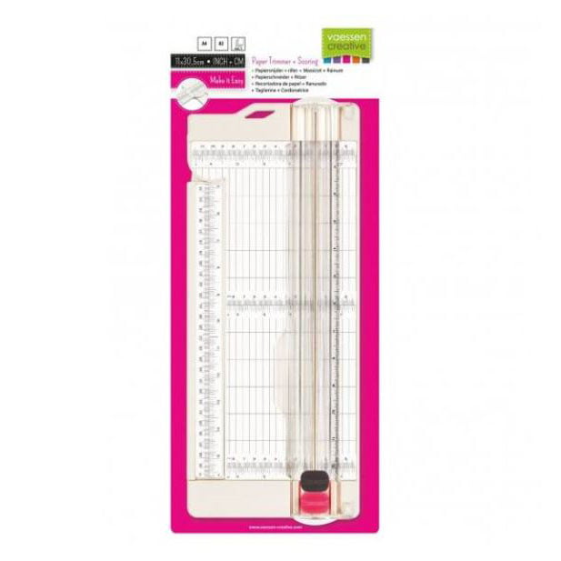 Laadukas ja jämäkkä Vaessen Creative -paperileikkuri, jossa on skräppipaperillekin sopiva 31,5cm leikkuuleveys. Leikkaamisen lisäksi tällä laitteella voit myös tehdä nuuttaukset esim. korttipohjiin. Kokoontaitettavalla jatkoviivaimella on pituutta jopa reilut 39,5 cm. Työskentelyalustalla on kokoa noin 11cm ilman jatkoviivaimen avaamista. Leikkurissa on mitat sekä senttimetreinä että tuumina ja sekä nuuttaus- että leikkuuterä ovat vaihdettavia.