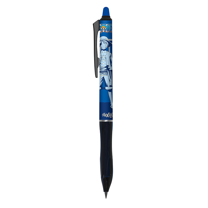 Pilotin suosittu Frixion Ball Plus kynä nyt lisensoituna erittäin suosittuun Japanilaiseen One Piece-sarjaan. Frixion Ball Plus kynässä on pois pyyhittävä muste, joten voit kirjoittaa ja pyyhkiä uudelleen ja uudelleen. Muste on lämpöherkkää ja katoaa siksi kitkan vuoksi, joka tapahtuu, kun kirjoitus pyyhitään pois kynän päässä olevalla pyyhekumilla. Frixion Ball kynässä on ergonominen, kolmion mallinen muotoilu, jonka ansiosta kynästä saa hyvän otteen. Kynä on valmistettu vähintään 80% kierrätetystä materiaalista. Kärjen koko on 0,7mm ja kirjoituksen leveys 0,35mm. Musteen väri on sininen ja se on vaihdettavissa uuteen.