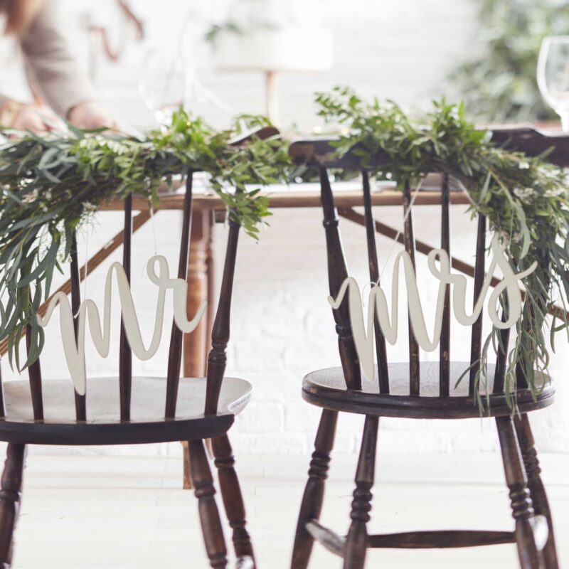 Puiset Mr & Mrs kyltit tuoleihin