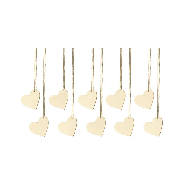 Puiset sydämen muotoiset tagit esimerkiksi paikkakorteiksi juhlapöytään tai muuhun koristeluun. Sydämen koko noin 6x5cm. Pakkauksessa 10 kpl sydän tageja ja juuttinarut niiden ripustukseen.