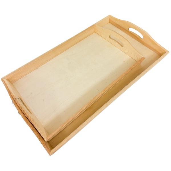 Kahden kappaleen setti puisia tarjottimia. Isomman tarjottimen koko 51x30x3,5cm, pienemmän 41x25x3,5cm. Puun pinta on käsittelemätöntä, eli voit maalata ja koristella tarjottimet mieleiseksi.
