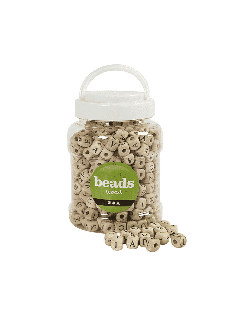 Puuhelmilajitelma 400ml purkissa. Helmien koko 9mm, aukon koko 3mm. Helmet ovat neliskulmaisia pyöristetyillä kulmilla ja niissä on sivuille painetut kirjaimet.
