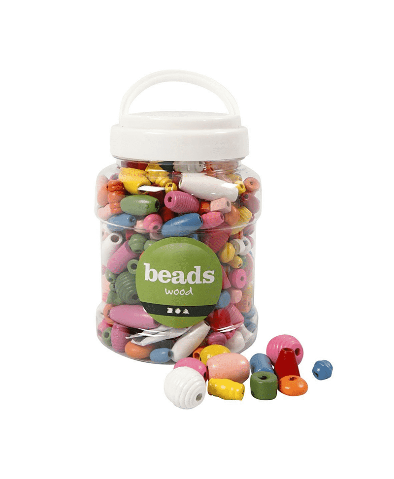 Puuhelmilajitelma 400ml purkissa. Helmien koko 5-28mm, aukon koko 2,5-3mm. Lajitelmassa eri värisiä ja muotoisia helmiä.