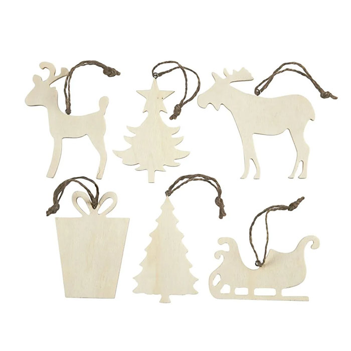 Vaneriset puukoristeet, jotka voi halutessaan maalata ja koristella esimerkiksi akryylimaaleilla ja maalitusseilla. Koristeissa ripustusnauhat mukana. Koristeiden koko noin 7-9cm. Pakkauksessa 6 erilaista jouluaiheista koristetta.